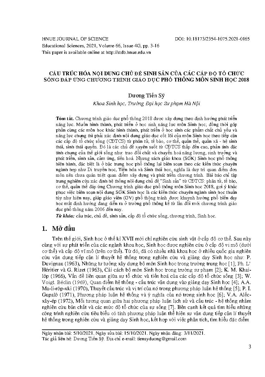 Cấu trúc hóa nội dung chủ đề sinh sản của các cấp độ tổ chức sống đáp ứng chương trình giáo dục phổ thông môn sinh học 2018 = The content structuralization of the reproductive topic about the levels of life organization eets the general education Program in Biology 2018