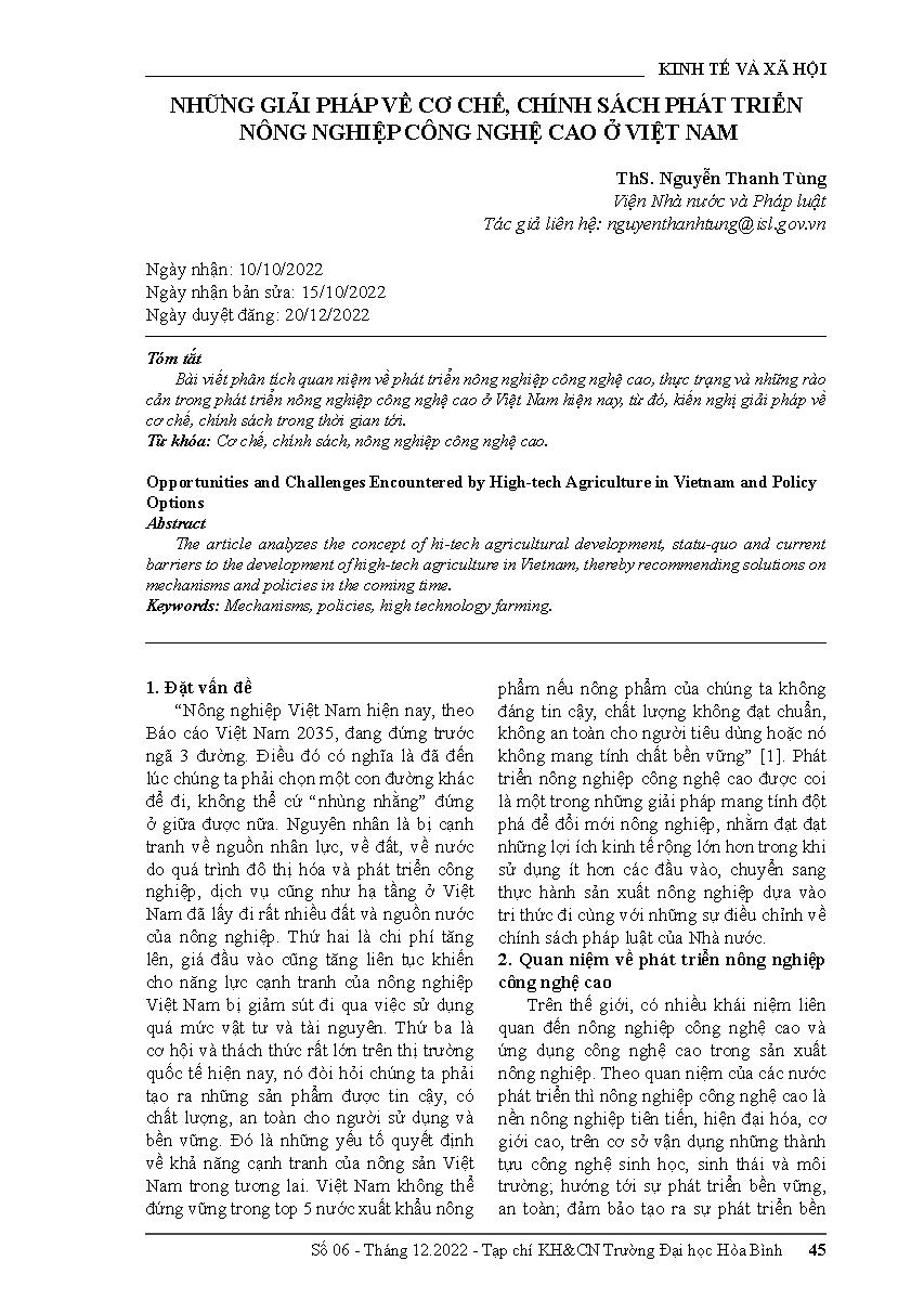 Những giải pháp về cơ chế, chính sách phát triển nền nông nghiệp công nghệ cao ở Việt Nam = Opportunities and challenges encountered by high-tech agriculture in Vietnam and policy options