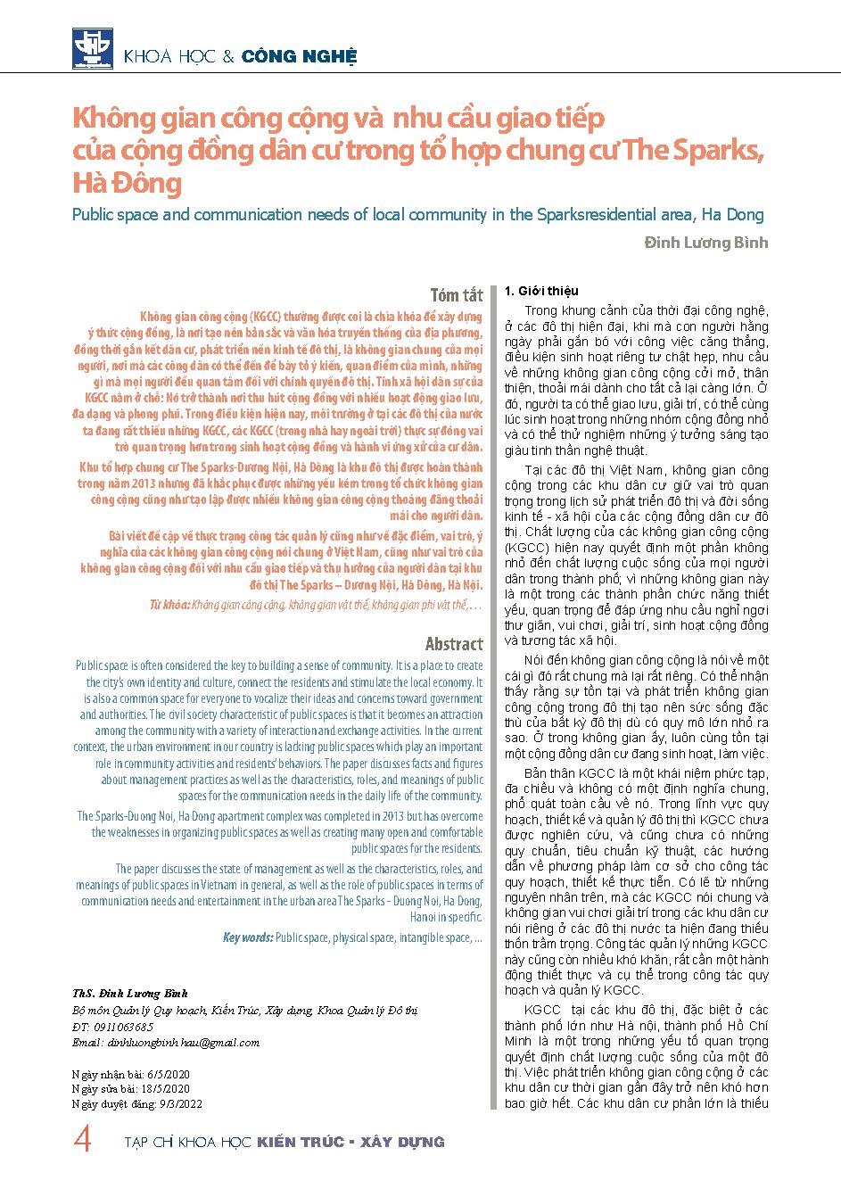 Không gian công cộng và nhu cầu giao tiếp của cộng đồng dân cư trong tổ hợp chung cư The Sparks, Hà Đông = Public space and communication needs of local community in the Sparksresidential area, Ha Dong