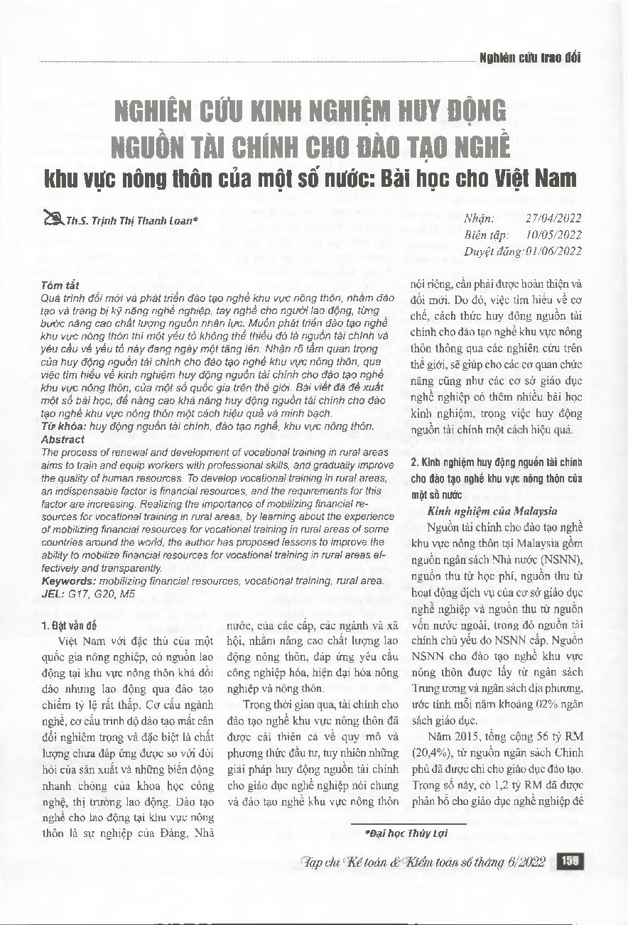 Nghiên cứu kinh nghiệm huy động nguồn tài chính cho đào tạo nghề khu vực nông thôn của một số nước: Bài học cho Việt Nam = Studying the experience of mobilizing financial resources for vocational training in rural areas of some countries: Lessons for Viet