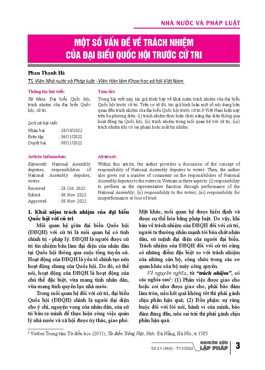 Một số vấn đề về trách nhiệm của đại biểu quốc hội trước cử tri = Discussions on Responsibilities of the National Assembly deputies to voters