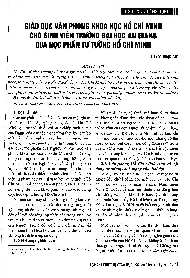Giáo dục văn phong khoa học Hồ Chí Minh cho sinh viên Trường Đại học An Giang qua học phần Tư tưởng Hồ Chí Minh = Educating the Ho Chi Minh scientific style for students of An Giang University through the Ho Chi Minh Thought module