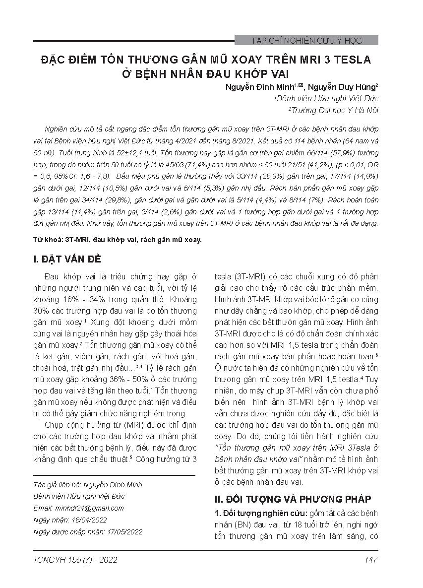 Đặc điểm tổn thương gân mũ xoay trên mri 3 tesla ở bệnh nhân đau khớp vai = Characteristics of rotator cuff injury on 3t-mr imaging of the patients with shouder pain
