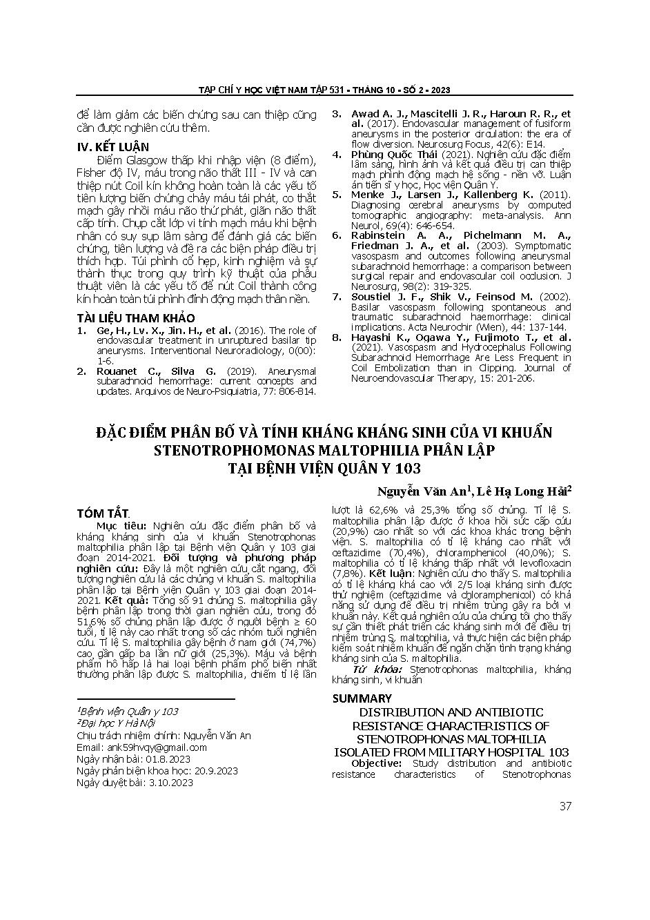 Đặc điểm phân bố và tính kháng kháng sinh của vi khuẩn Stenotrophomonas maltophilia phân lập tại Bệnh viện Quân y 103 = Distribution and antibiotic resistance characteristics of Stenotrophonas maltophilia isolated from military hospital 103