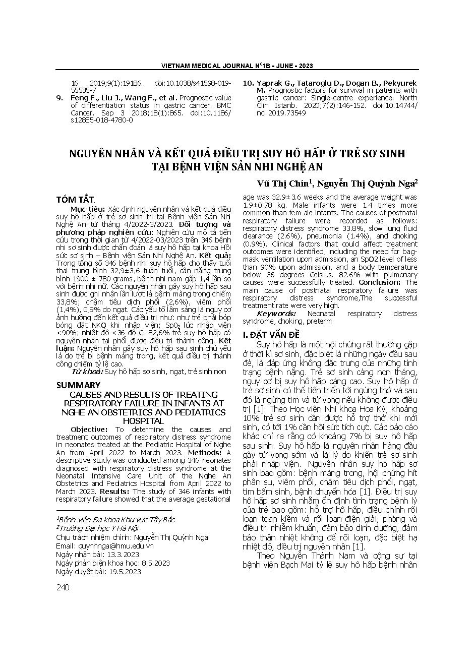 Nguyên nhân và kết quả điều trị suy hô hấp ở trẻ sơ sinh tại Bệnh viện Sản nhi Nghệ An = Causes and results of treating respiratory failure in infants at Nghe An obstetrics and pediatrics hospital