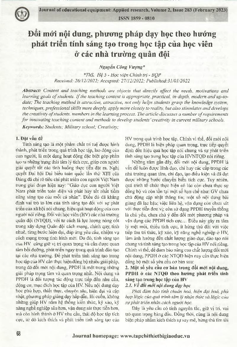 Đổi mới nội dung, phương pháp dạy học theo hướng phát triển tính sáng tạo trong học tập của học viên ở các nhà trường quân đội = Innovating content and teaching methods in the direction of developing creativity in learning of students in military schools