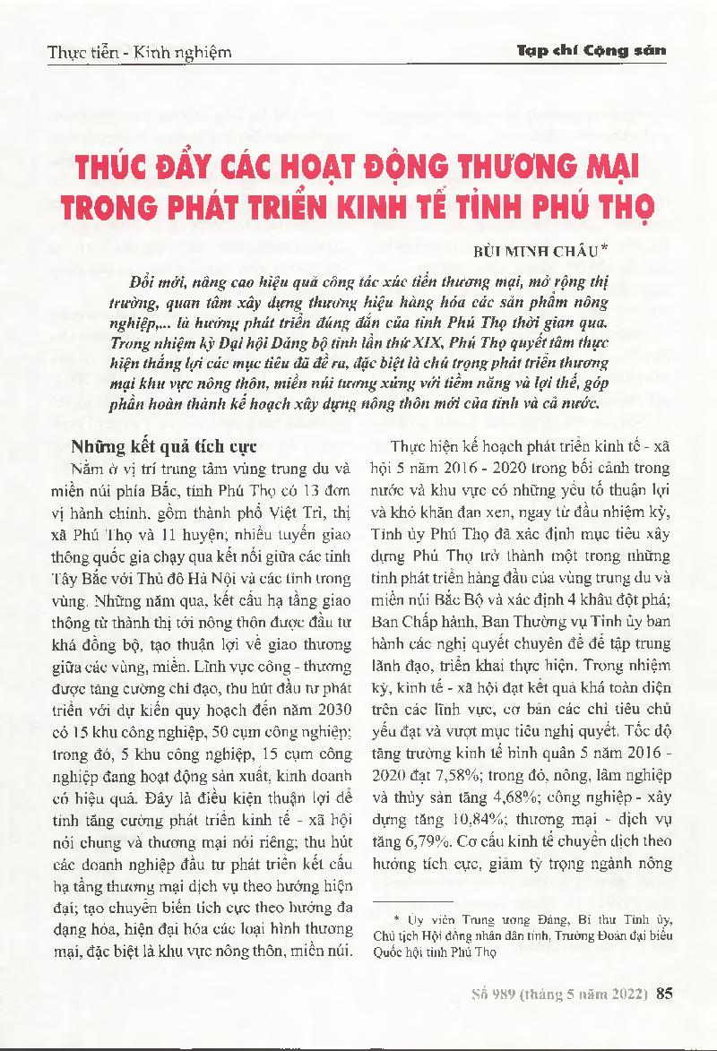 Thúc đẩy các hoạt động thương mại trong phát triển kinh tế tỉnh Phú Thọ = Promoting commercial activities in economic development of Phu Tho province