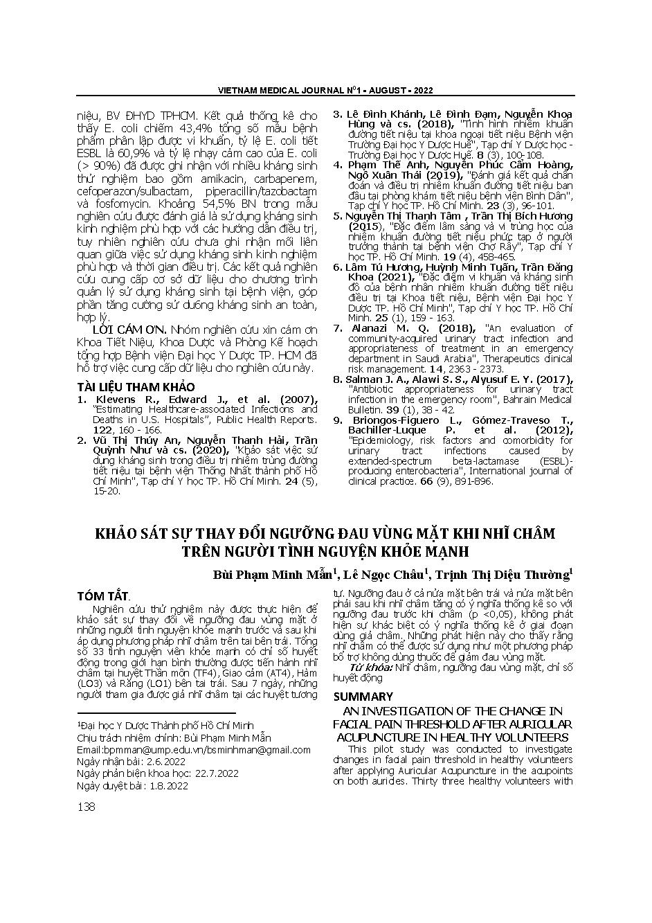 Khảo sát sự thay đổi ngưỡng đau vùng mặt khi nhĩ châm trên người tình nguyện khỏe mạnh = An investigation of the change in facial pain threshold after auricular acupuncture in healthy volunteers