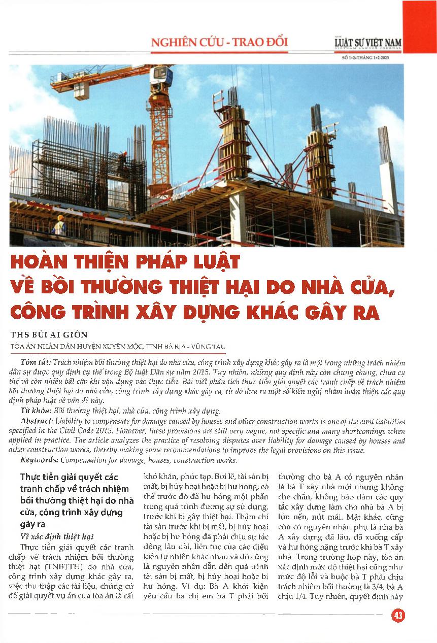 Hoàn thiện pháp luật về bồi thường thiệt hại do nhà cửa, công trình xây dựng khác gây ra = Perfecting the law on compensation for damage caused by houses and other construction works