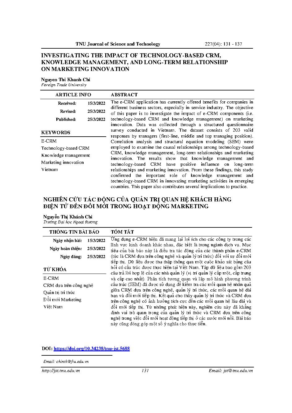 Nghiên cứu tác động của quản trị quan hệ khách hàng điện tử đến đổi mới trong hoạt động marketing = Investigating the impact of technology-based CRM, knowledge management, and long-term relationship on marketing innovation