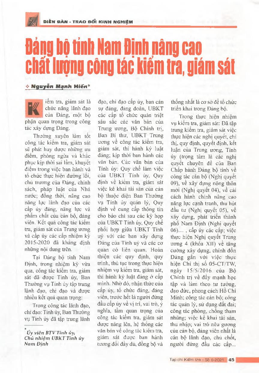 Đảng bộ tỉnh Nam Định nâng cao chất lượng công tác kiểm tra, giám sát