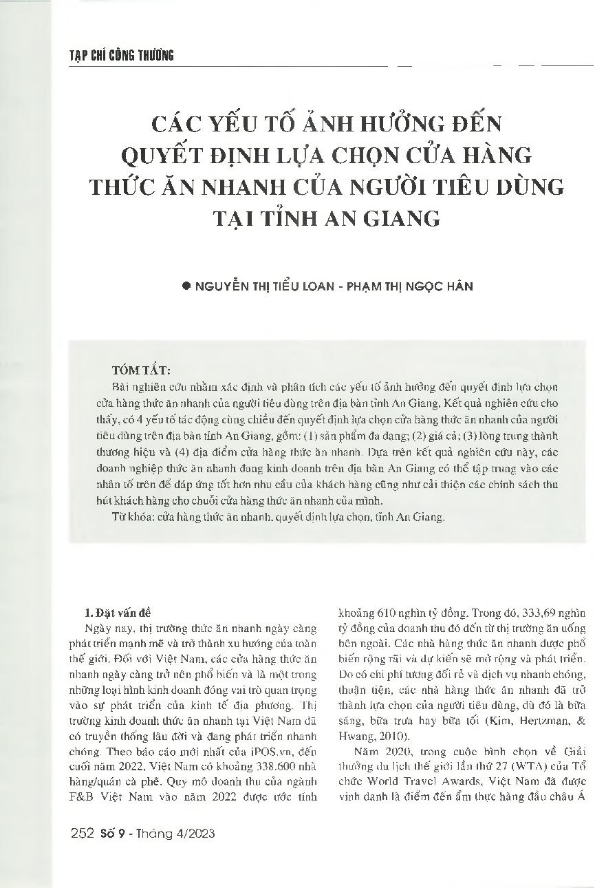 Các yếu tố ảnh hưởng đến quyết định lựa chọn cửa hàng thức ăn nhanh của người tiêu dùng tại tỉnh An Giang