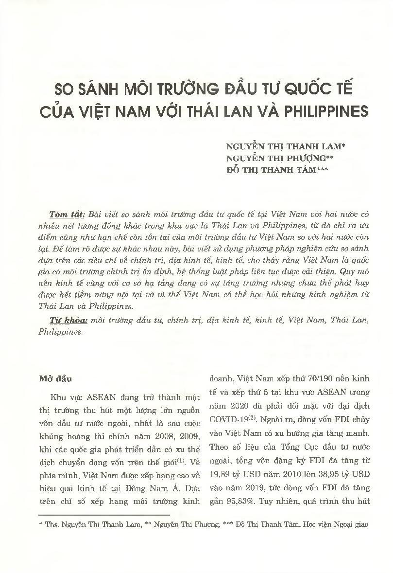 So sánh môi trường đầu tư quốc tế của Việt Nam với Thái Lan và Philippines = Comparision of the International Investment Environment of Vietnam with Thailand and the Philippines