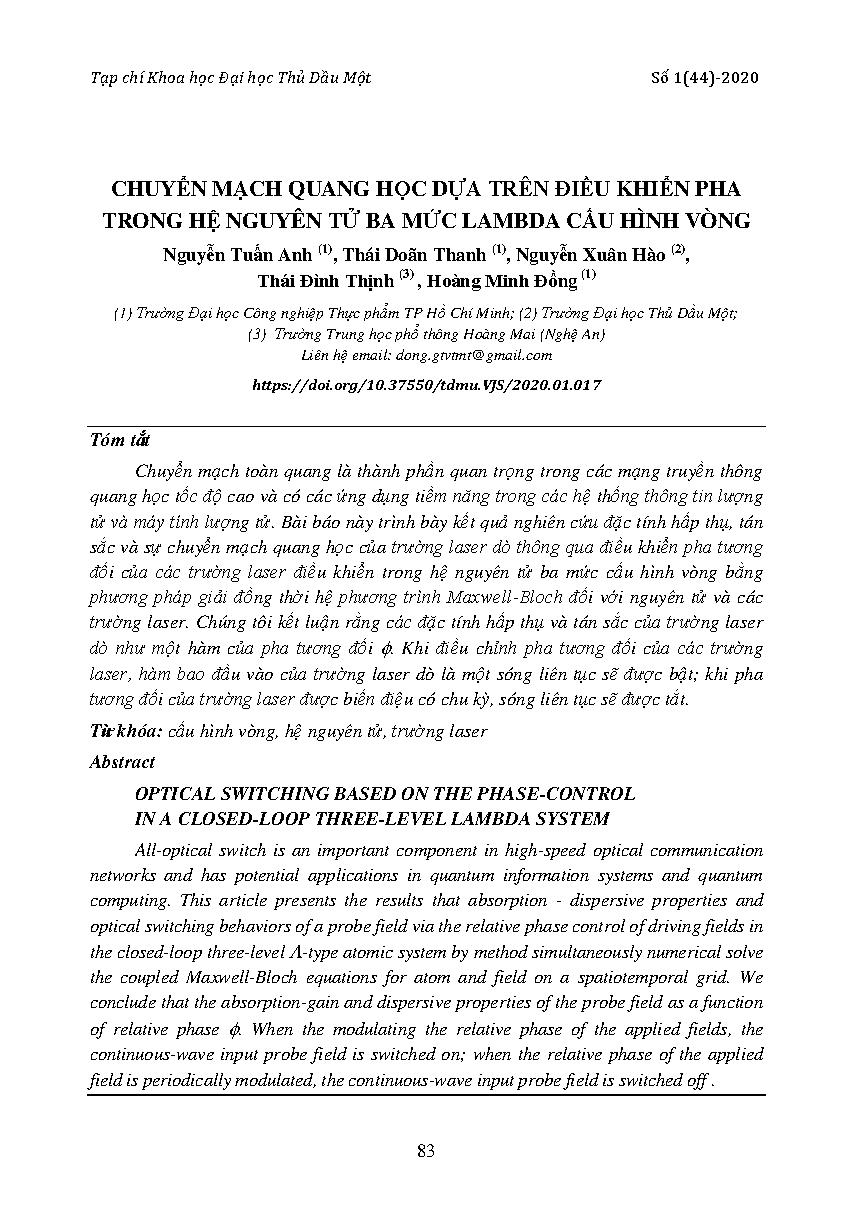 Chuyển mạch quang học dựa trên điều khiển pha trong hệ nguyên tử ba mức lambda cấu hình vòng = Optical switching based on the phase-control in a closed-loop three-level lambda system
