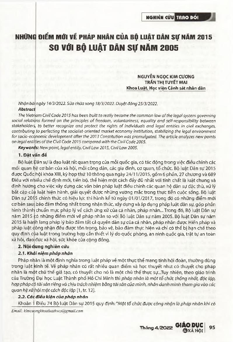 Những điểm mới về pháp nhân của Bộ luật Dân sự năm 2015 so với Bộ luật Dân sự năm 2005 = New points on legal entities of the Vietnam Civil Code 2015 compared with the Civil Code 2005.