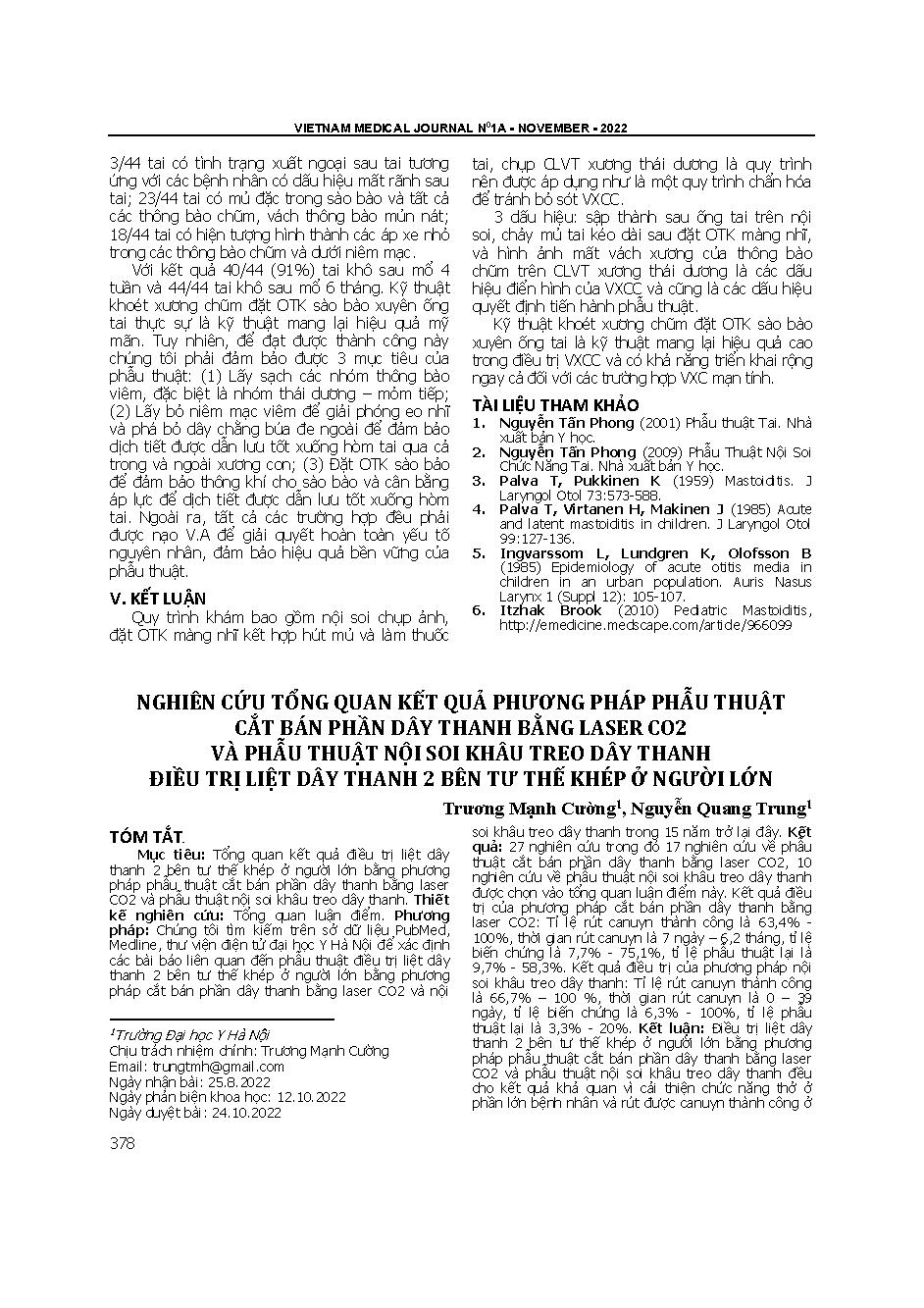 Nghiên cứu tổng quan kết quả phương pháp phẫu thuật cắt bán phần dây thanh bằng laser CO2 và phẫu thuật nội soi khâu treo dây thanh điều trị liệt dây thanh 2 bên tư thế khép ở người lớn = Scoping review about results of method surgical posterior cordotomy