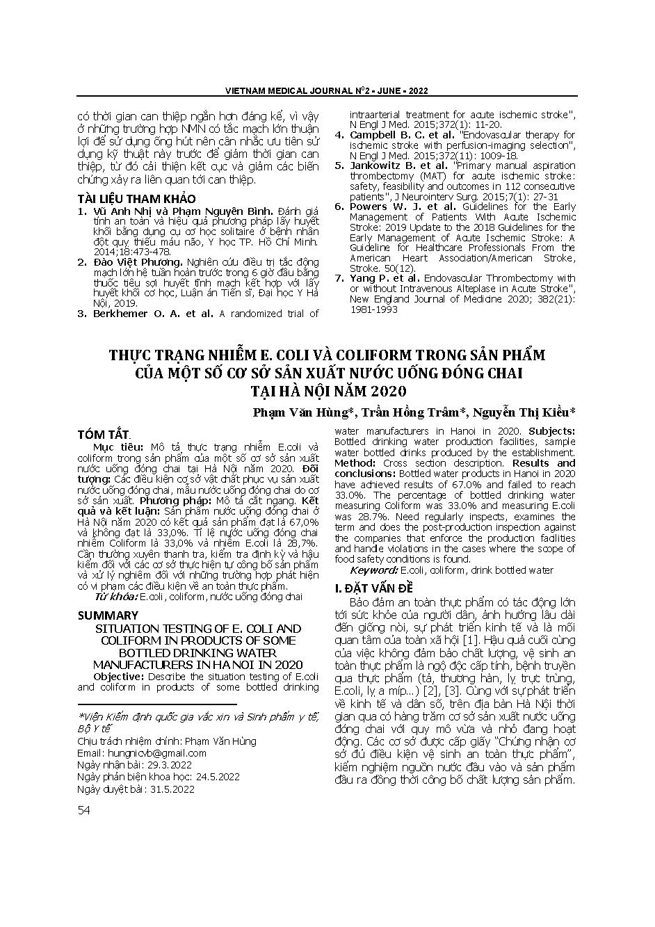 Thực trạng nhiễm E. coli và coliform trong sản phẩm của một số cơ sở sản xuất nước uống đóng chai tại Hà Nội năm 2020 = Situation testing of E. coli and coliform in products of some bottled drinking water manufacturers in Ha Noi in 2020