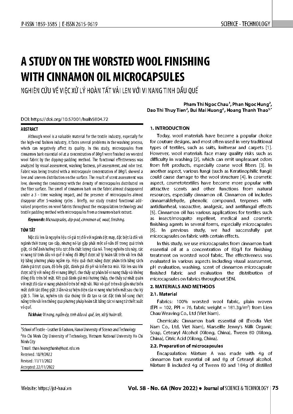 Nghiên cứu về việc xử lý hoàn tất vải len với vi nang tinh dầu quế = A study on the worsted wool finishing with cinnamon oil microcapsules
