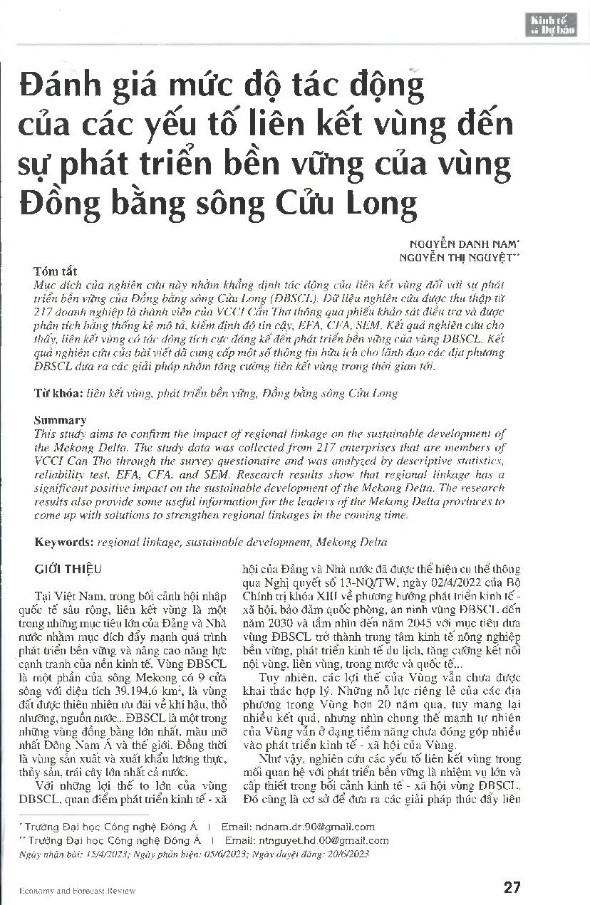 Đánh giá mức độ tác động của các yếu tố liên kết vùng đen sự phát triển bền vững của vùng Đồng bằng sông Cửu Long