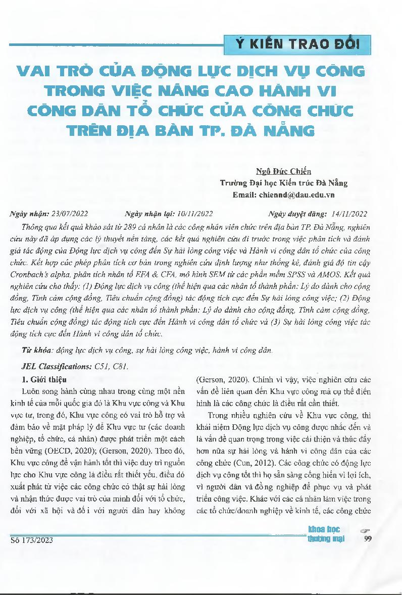 Vai trò của động lực dịch vụ công trong việc nâng cao hành vi công dân tổ chức của công chức trên địa bàn Thành Phố Đà Nẵng = The Role of Public Services Motivation in Improving Organizational Citizen Behaviors of Civilities in Danang City