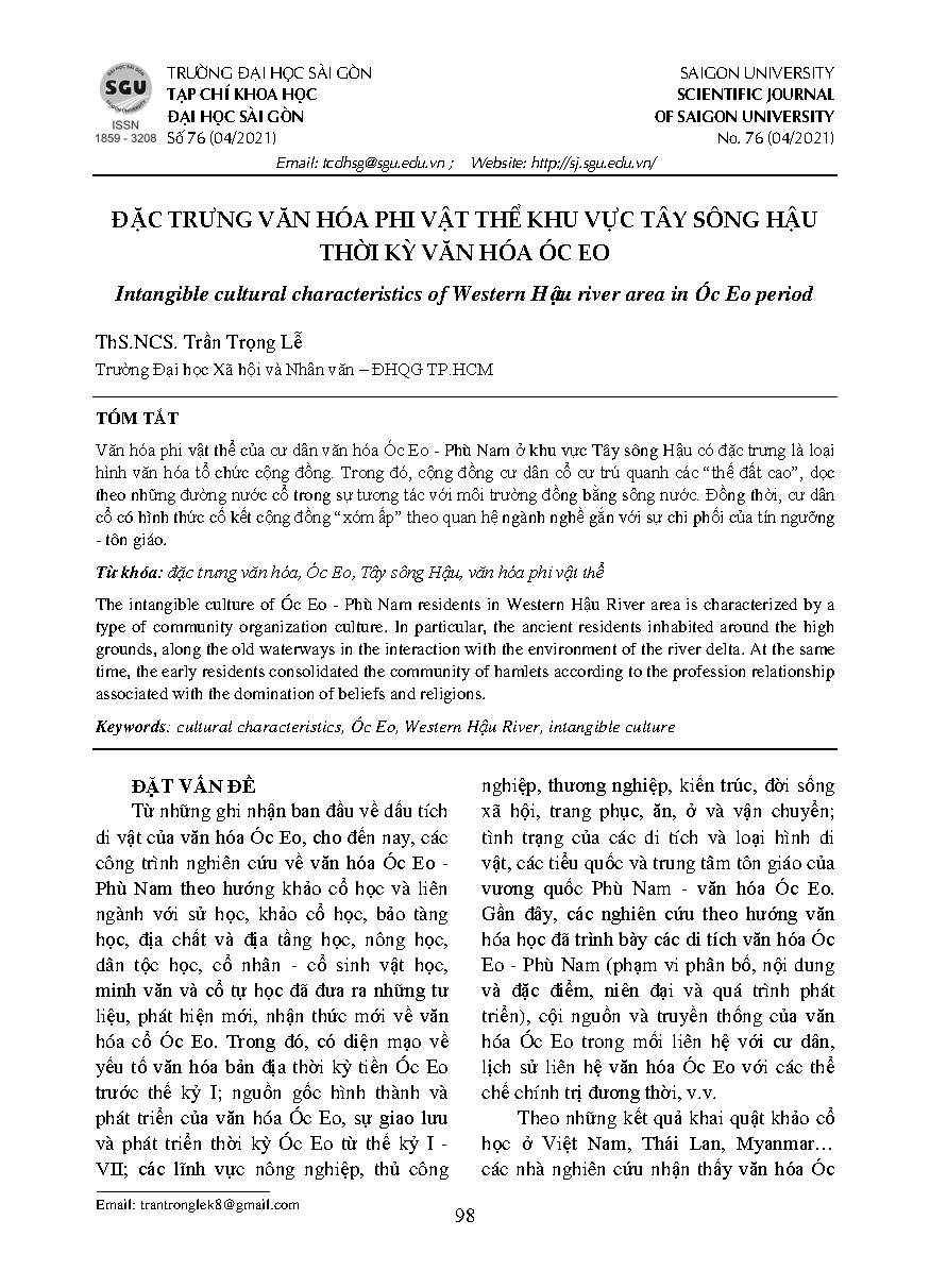 Đặc trưng văn hóa phi vật thể khu vực Tây sông Hậu thời kỳ văn hóa Óc Eo = Intangible cultural characteristics of Western Hậu river area in Oc Eo period