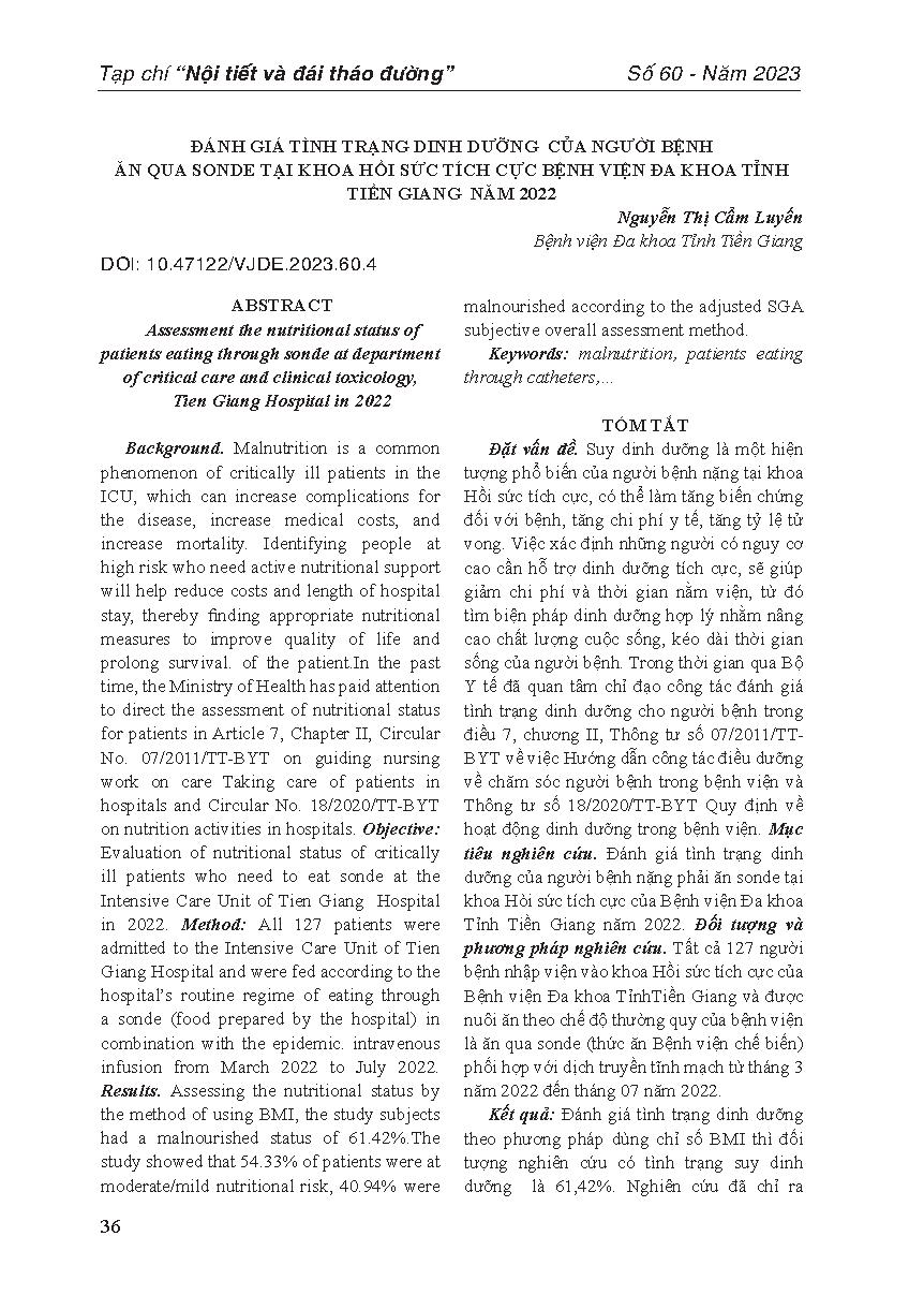 Đánh giá tình trạng dinh dưỡng của người bệnh ăn qua sonde tại Khoa Hồi sức tích cực Bệnh viện Đa khoa tỉnh Tiền Giang năm 2022