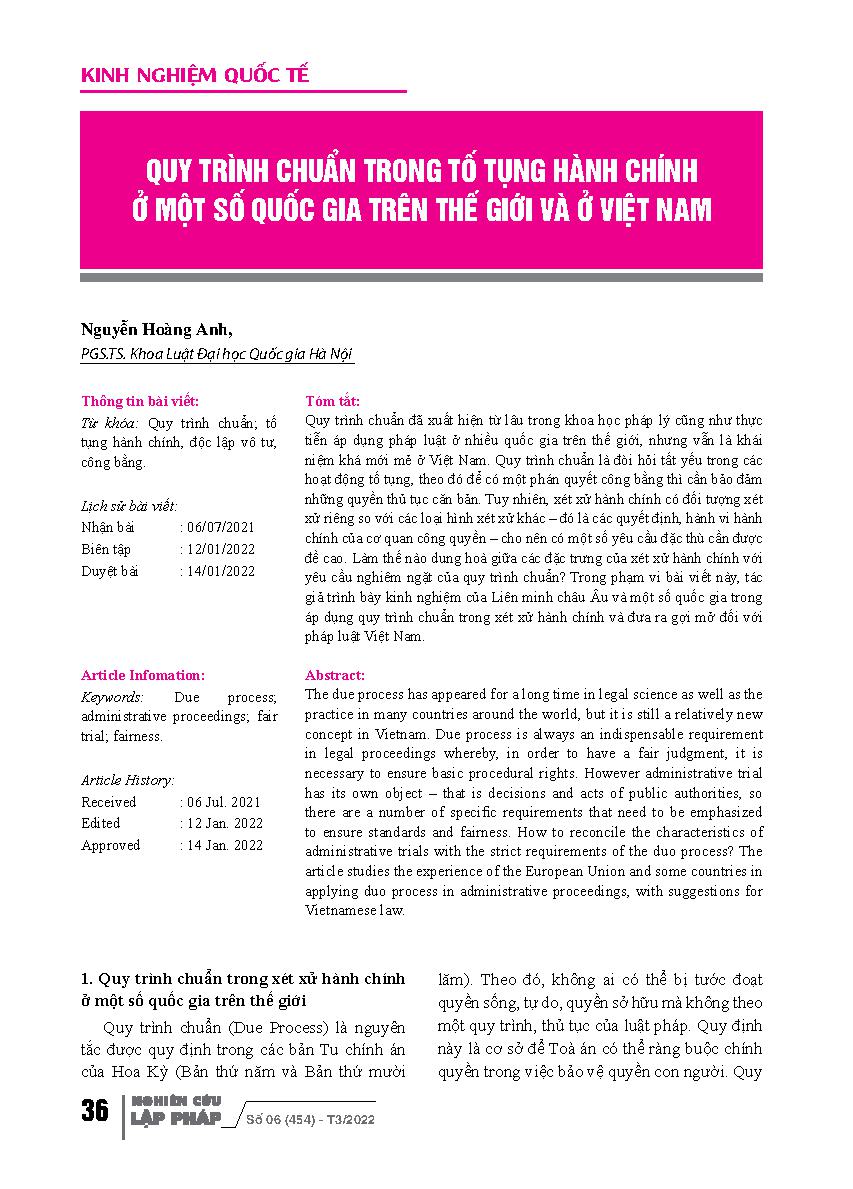 Quy trình chuẩn trong tố tụng hành chính ở một số quốc gia trên thế giới và ở Việt Nam = Due Process in Administrative Proceedings in Foreign Countries and Vietnam
