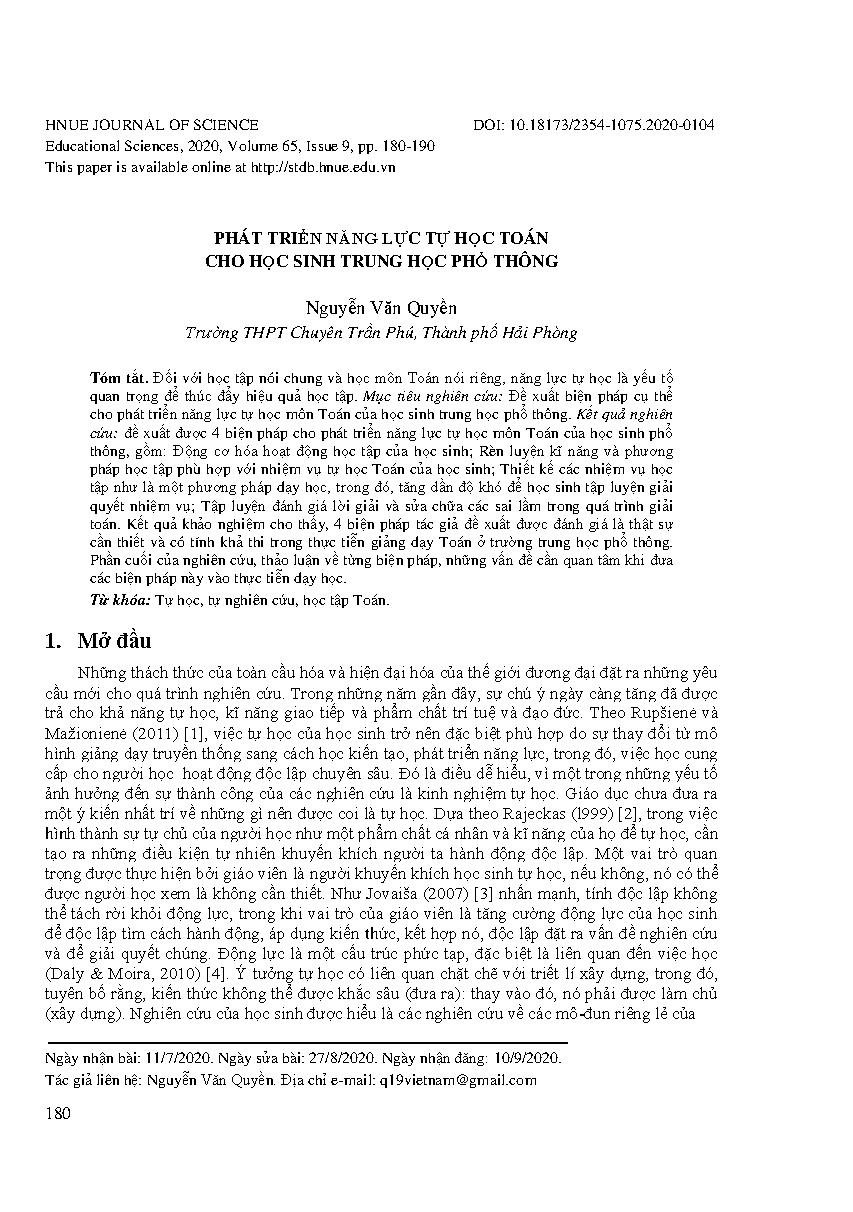 Phát triển năng lực tự học toán cho học sinh trung học phổ thông = Developing maths self-study capacity among high school students