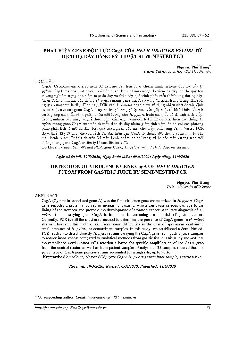 Phát hiện gene độc lực CagA của helicobacter pylori từ dịch dạ dày bằng kỹ thuật Semi-Nested PCR = Detection of virulence gene CagA of helicobacter pylori from gastric juice by Semi-Nested-PCR