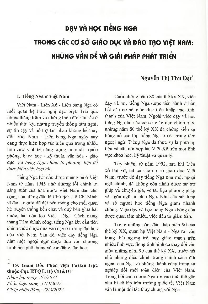 Dạy và học Tiếng Nga trong các cơ sở giáo dục và đào tạo Việt Nam: Những vấn đề và giải pháp phát triển