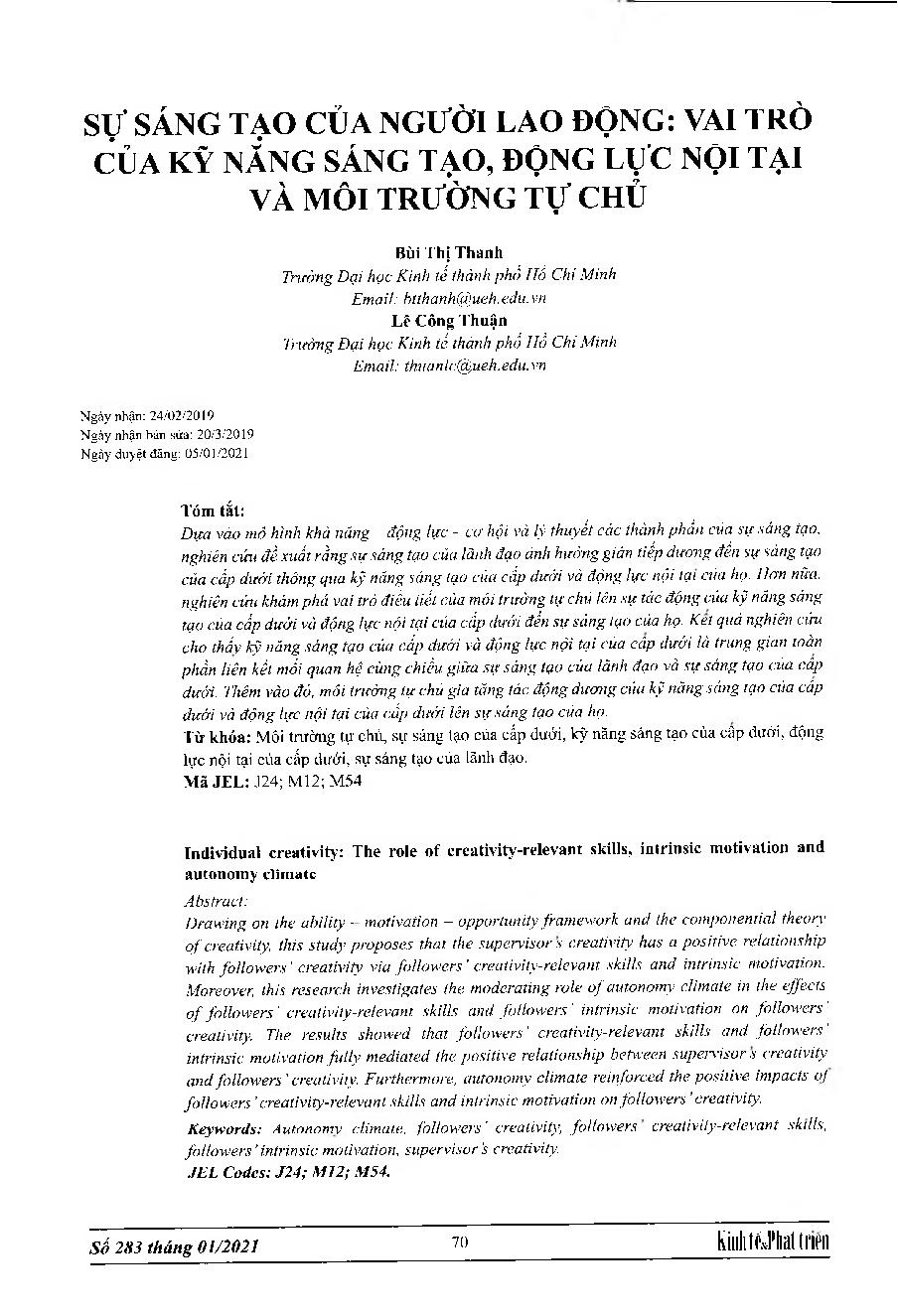Sự sáng tạo của người lao động: Vai trò của kỹ năng sáng tạo, động lực nội tại và môi trường tự chủ