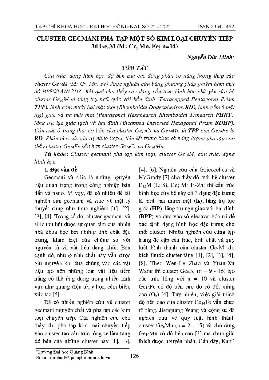 Cluster gecmani pha tạp một số kim loại chuyển tiếp 3d GenM (M: Cr, Mn, Fe; n=14) = Metal-3d doped germanium clusters genm (m: cr, mn, fe; n=14)
