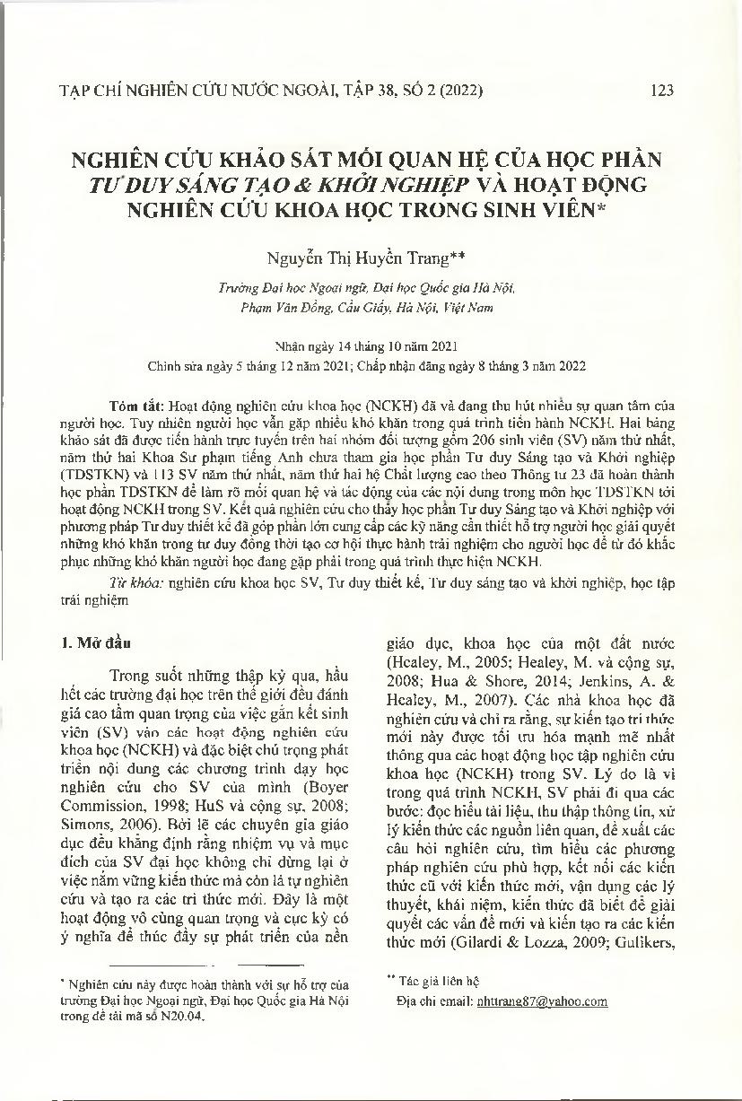 Nghiên cứu khảo sát mối quan hệ của học phần Tư duy sáng tạo & Khởi nghiệp và hoạt động nghiên cứu khoa học trong sinh viên = An Analysis on the Relationship Between the Course Innovative & Entrepreneurial Mindset and Students’ Research Activities