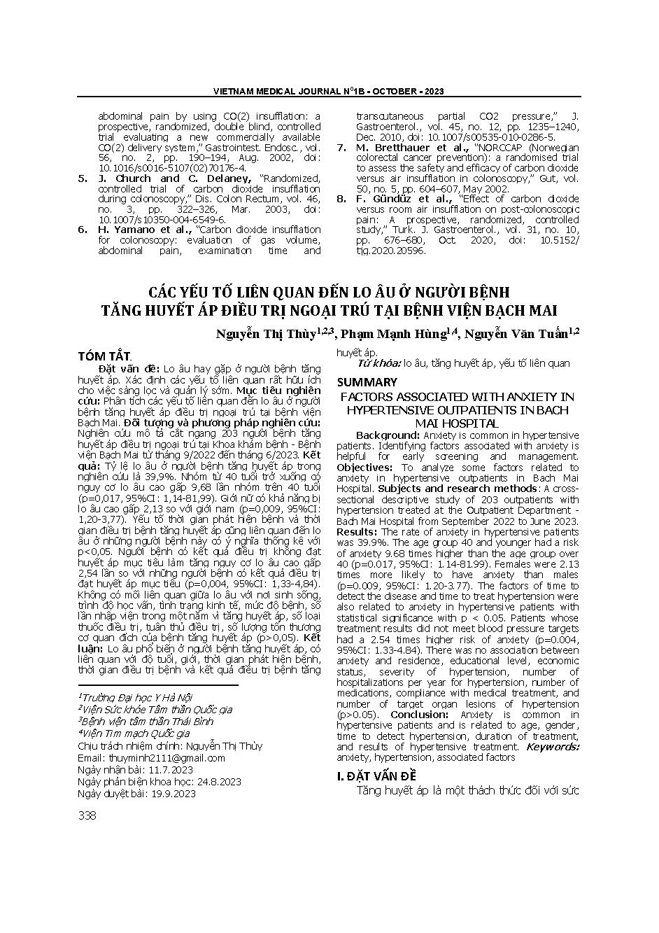 Các yếu tố liên quan đến lo âu ở người bệnh tăng huyết áp điều trị ngoại trú tại Bệnh viện Bạch Mai = Factors associated with anxiety in hypertensive outpatients in Bach Mai hospital