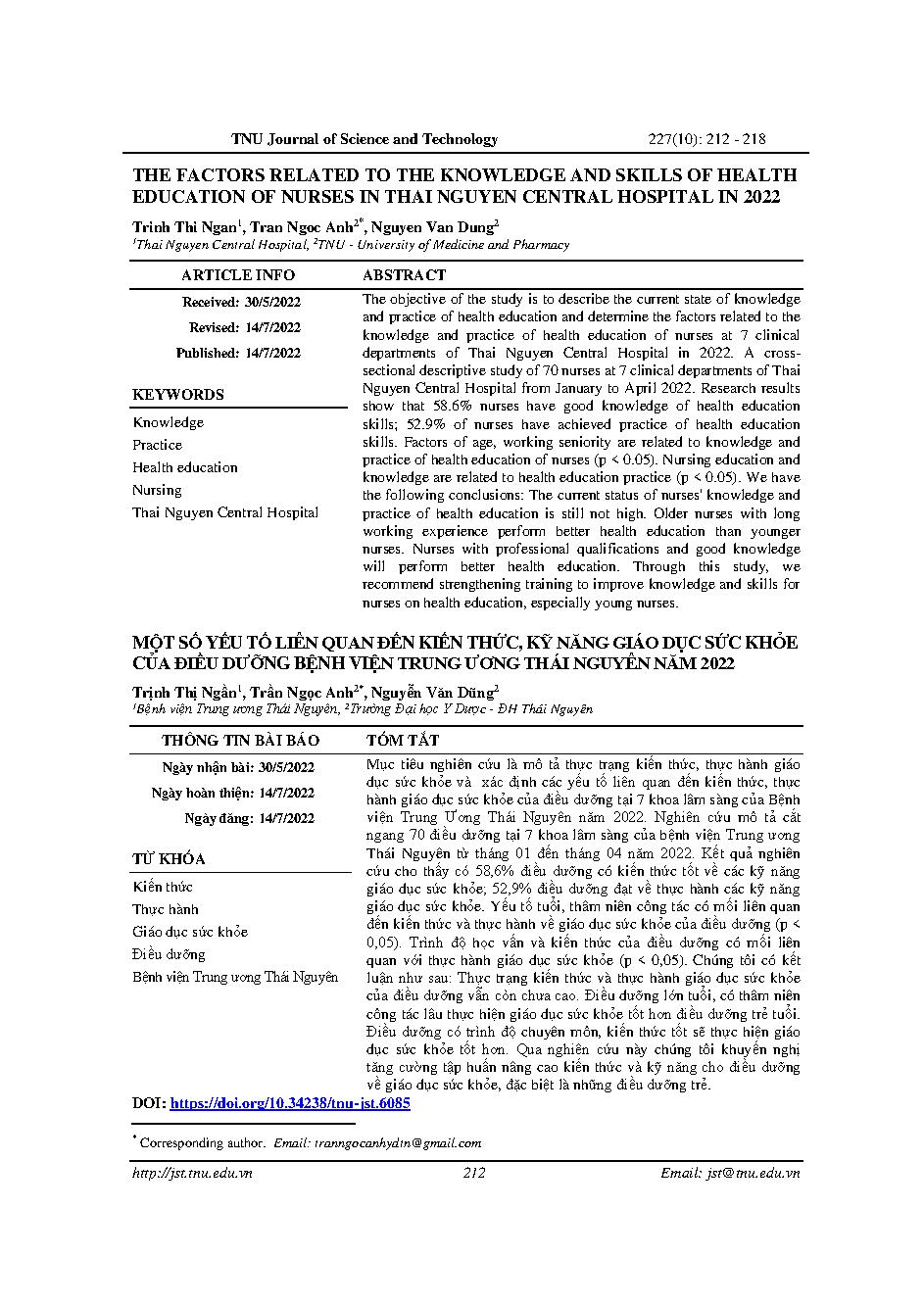Một số yếu tố liên quan đến kiến thức, kỹ năng giáo dục sức khỏe của điều dưỡng bệnh viện trung ương Thái Nguyên năm 2022 = The factors related to the knowledge and skills of health education of nurses in Thai Nguyen central hospital in 2022