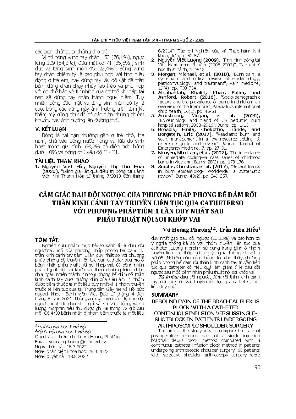 Cảm giác đau dội ngược của phương pháp phong bế đám rối thần kinh cánh tay truyền liên tục qua catheter so với phương pháp tiêm 1 lần duy nhất sau phẫu thuật nội soi khớp vai = Rebound pain of the brachial plexus block with a catheter continuous infusion