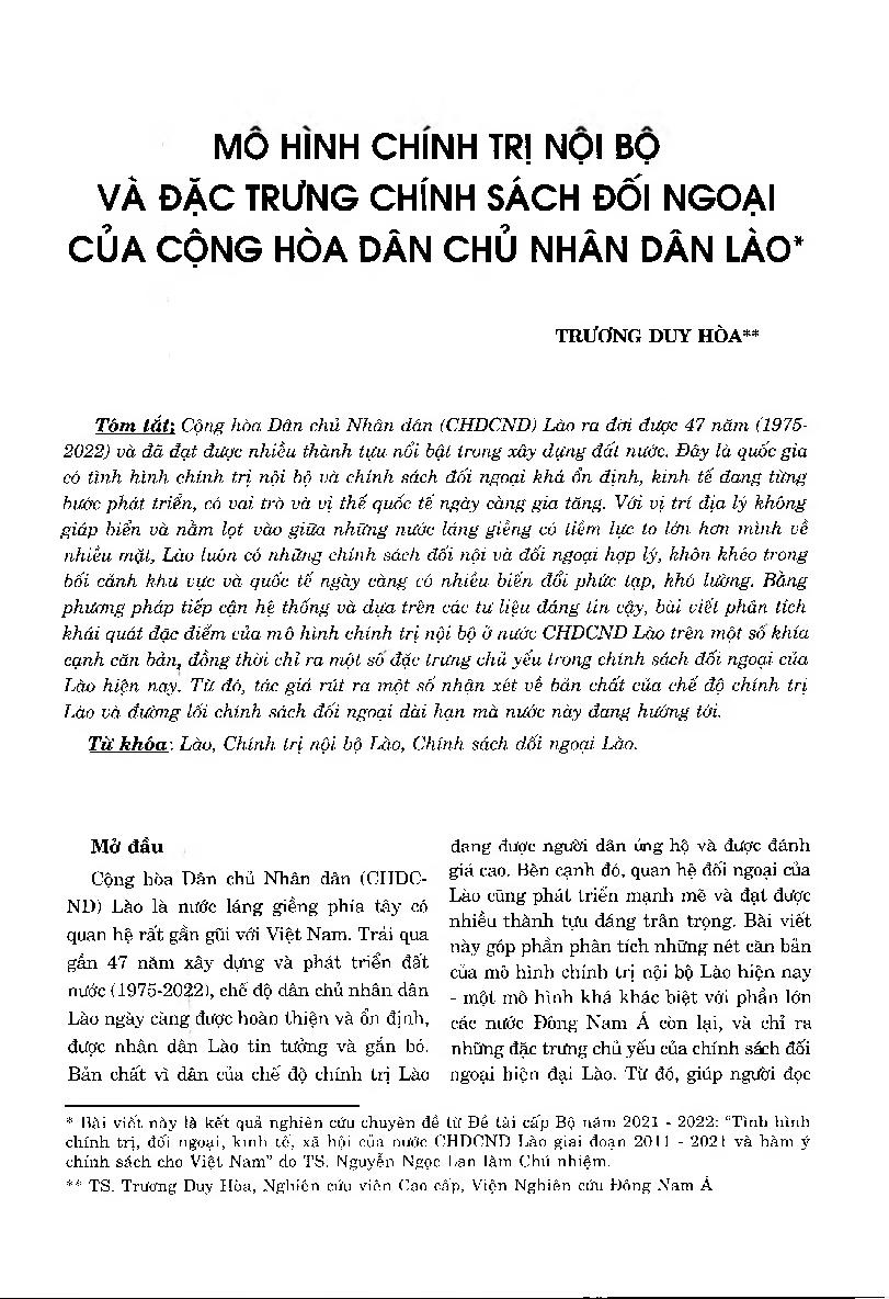 Mô hình chính trị nội bộ và đặc trưng chính sách đối ngoại của Cộng hòa dân chủ nhân dân Lào = Internal Political Model and Foreign Policy Features of Lao PDR