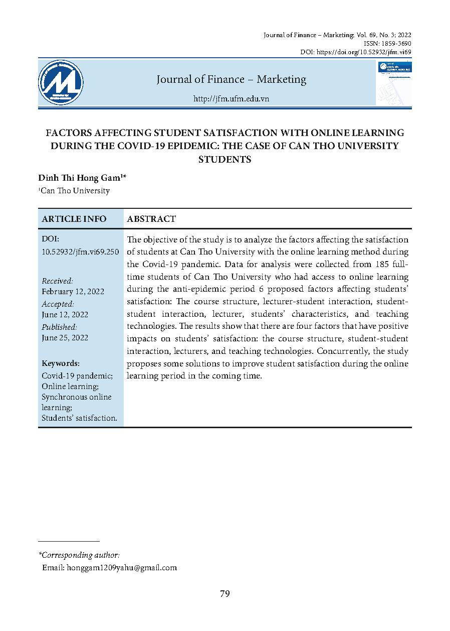 Các yếu tố ảnh hưởng đến sự hài lòng của sinh viên đối với học trực tuyến trong thời gian chống dịch covid-19: Trường hợp sinh viên Trường Đại học Cần Thơ = Factors affecting student satisfaction with online learning during the Covid-19 epidemic: the case