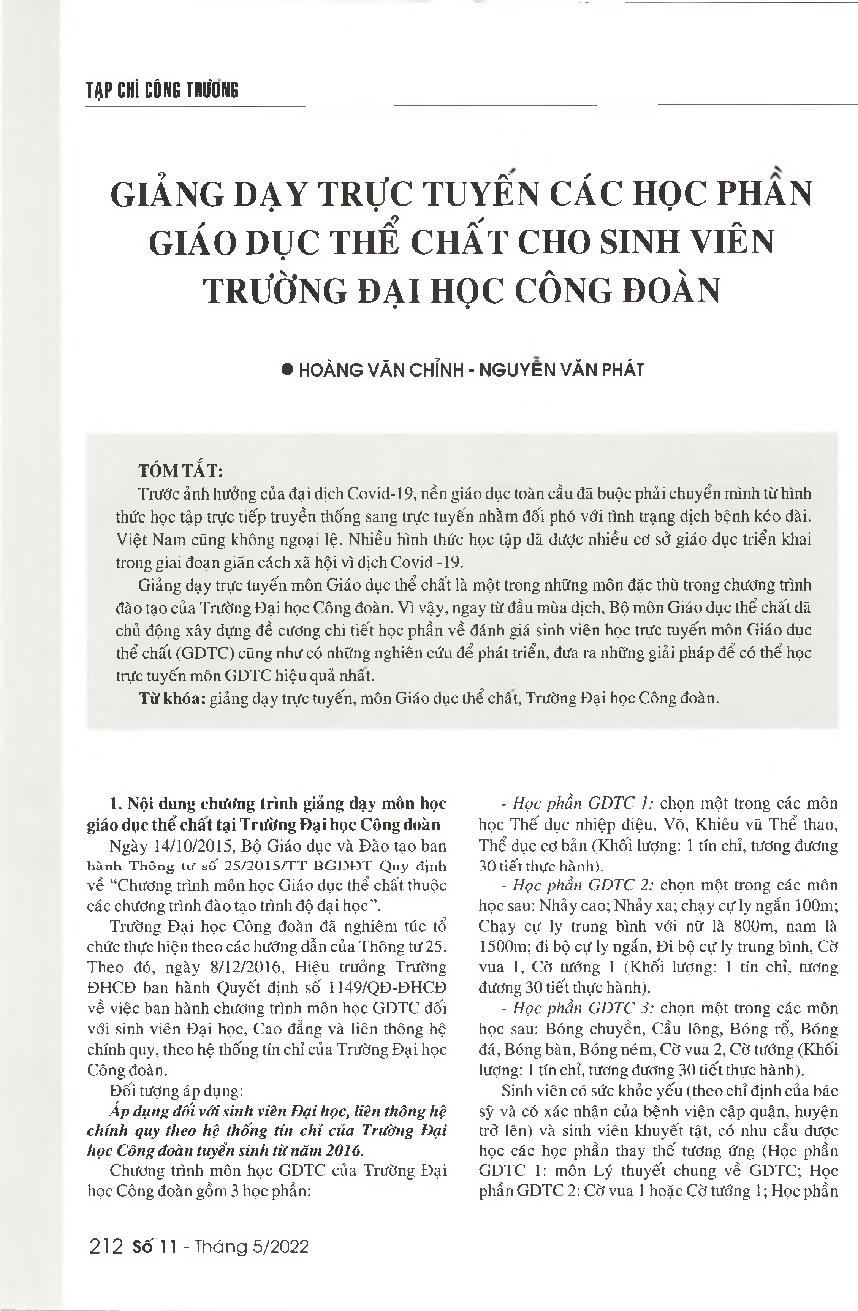 Giảng dạy trực tuyến các học phần giáo dục thể chất cho sinh viên Trường Đại học Công đoàn = Teaching the Physical Education subject online for students of the Trade Union University