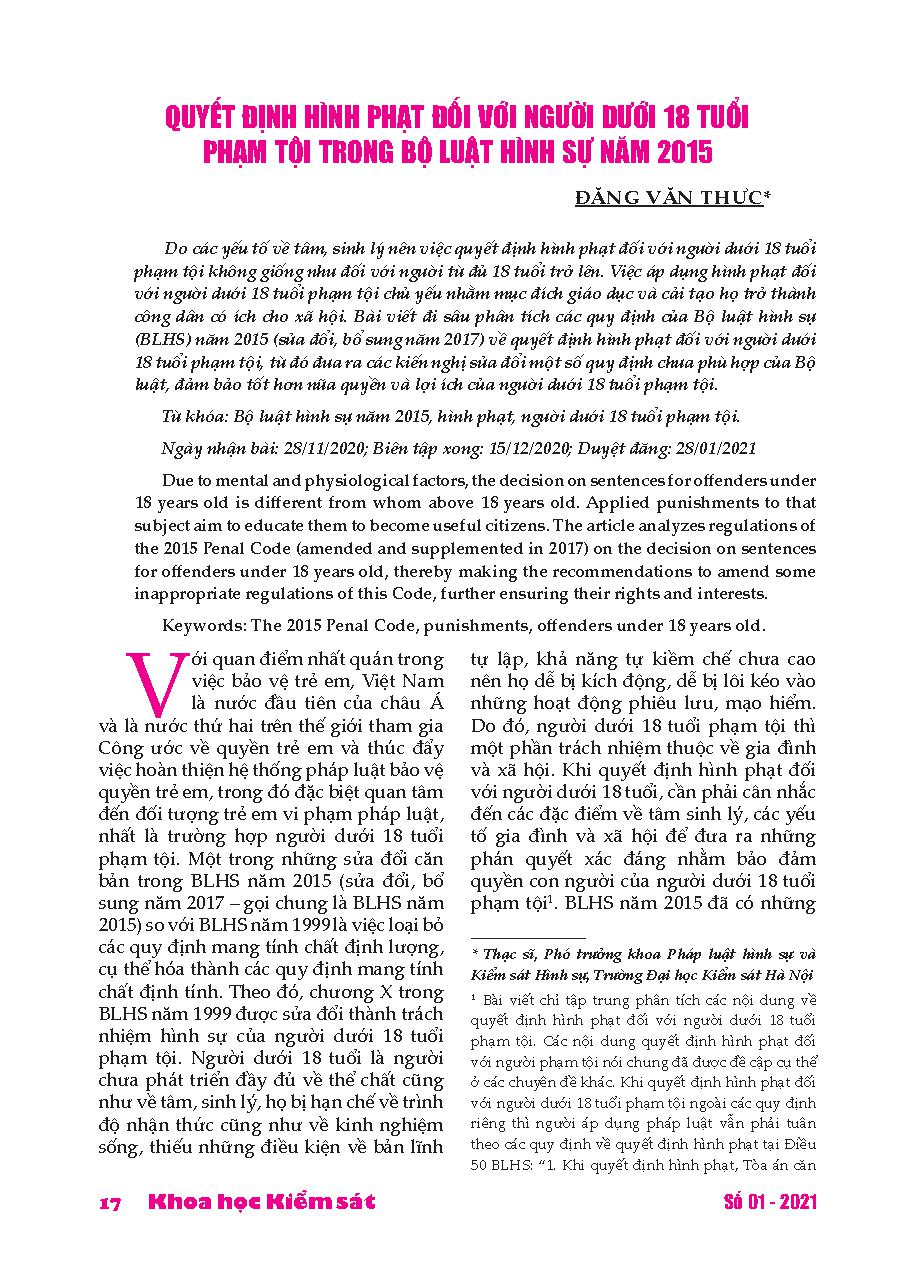 Quyết định hình phạt đối với người dưới 18 tuổi phạm tội trong Bộ luật hình sự năm 2015 = Penalty decisions for people under 18 who commit crimes in the 2015 Penal Code