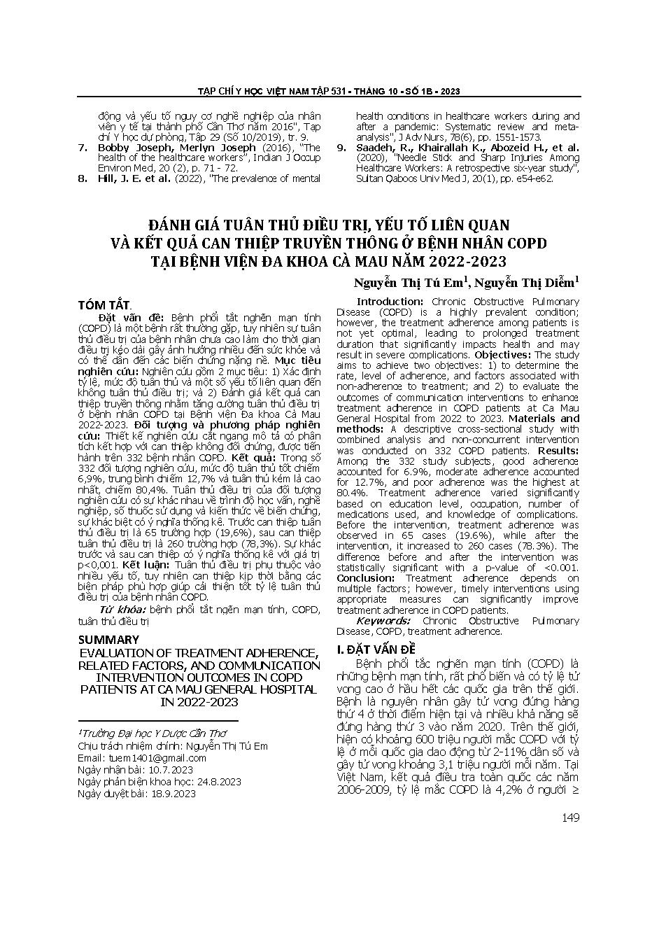 Đánh giá tuân thủ điều trị, yếu tố liên quan và kết quả can thiệp truyền thông ở bệnh nhân COPD tại Bệnh viện Đa khoa Cà Mau năm 2022-2023 = Evaluation of treatment adherence, related factors, and communication intervention outcomes in COPD patients at Ca