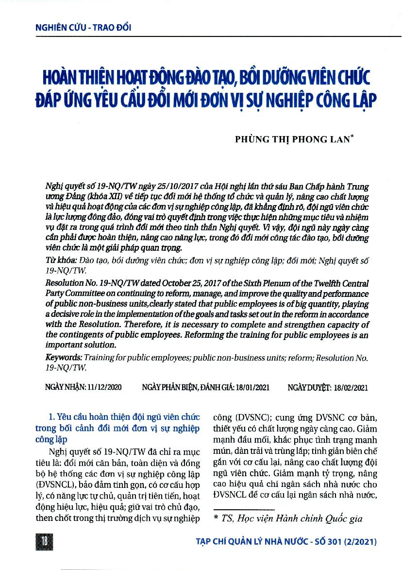 Hoàn thiện hoạt động đào tạo, bồi dưỡng viên chức đáp ứng yêu cầu đổi mới đơn vị sự nghiệp công lập = To perfect public employee training and retraining activities to meet the requirements of reforming public non-business units