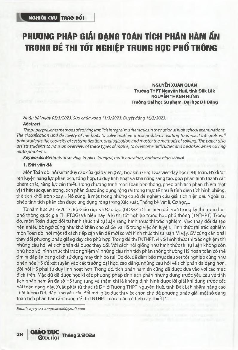 Phương pháp giải dạng toán tích phân hàm ẩn trong đề thi tốt nghiệp trung học phổ thông = Methods of solving implicit integral mathematics in the national high school examinations