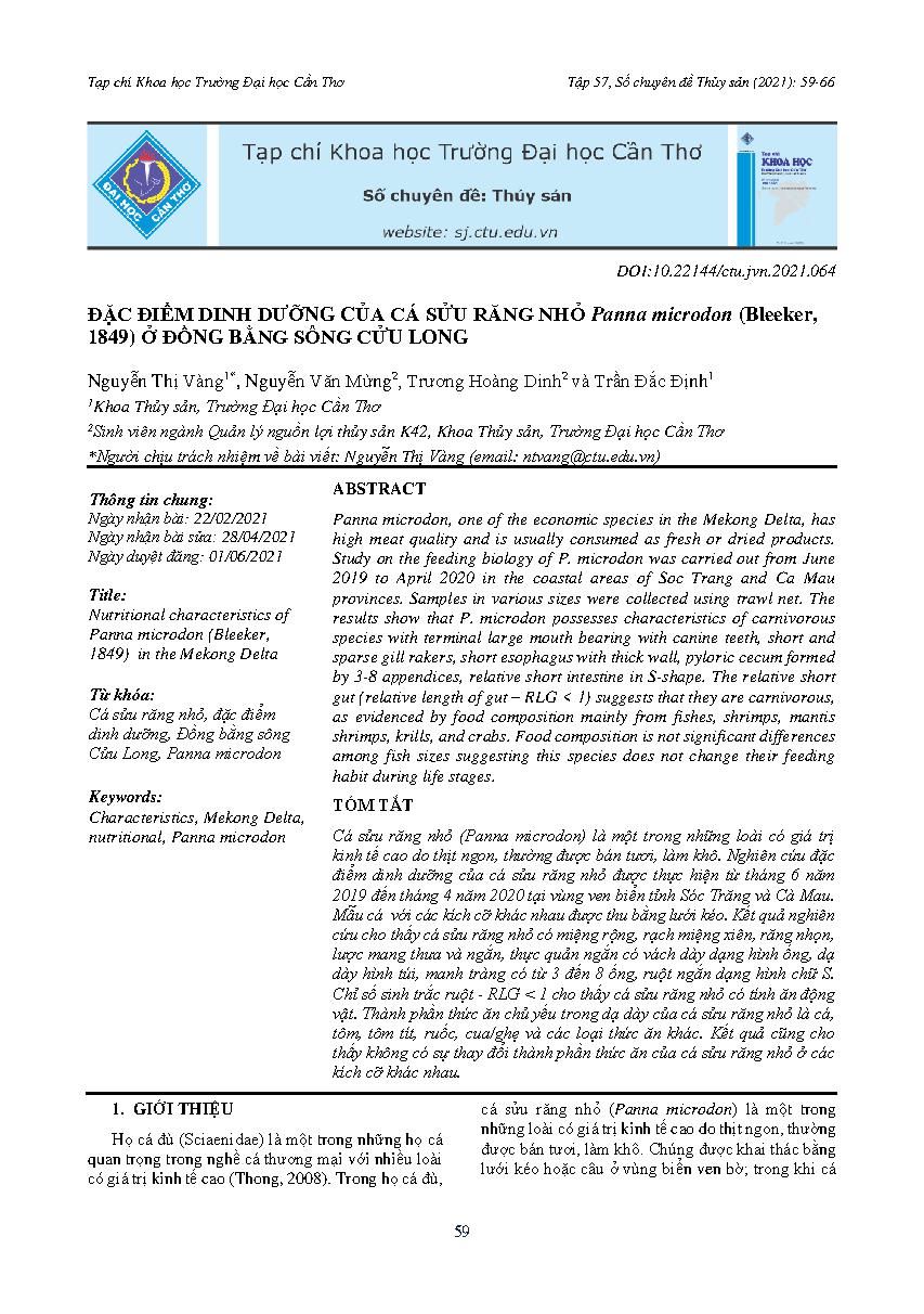 Đặc điểm dinh dưỡng của cá sửu răng nhỏ Panna microdon (Bleeker, 1849) ở Đồng bằng sông Cửu Long = Nutritional characteristics of Panna microdon (Bleeker, 1849) in the Mekong Delta