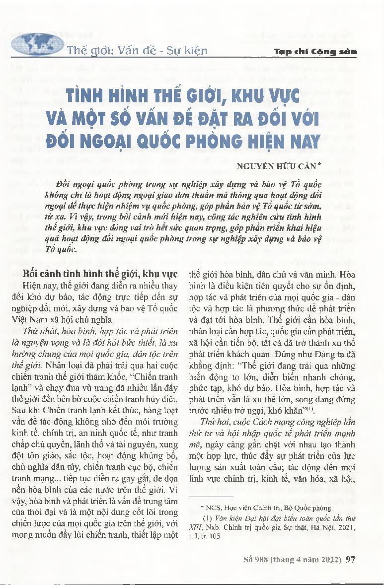 Tình hình thế giới, khu vực và một số vấn đề đặt ra đối với đối ngoại quốc phòng hiện nay = The situation of the world, the region and some issues facing defense diplomacy today