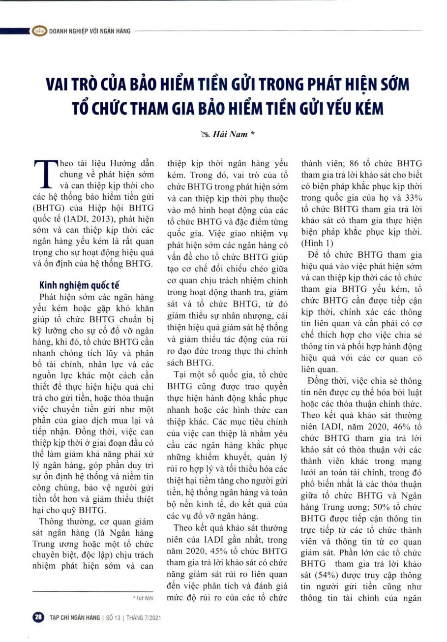 Vai trò của Bảo hiểm tiền gửi trong phát hiện sớm tổ chức tham gia bảo hiểm tiền gửi yếu kém