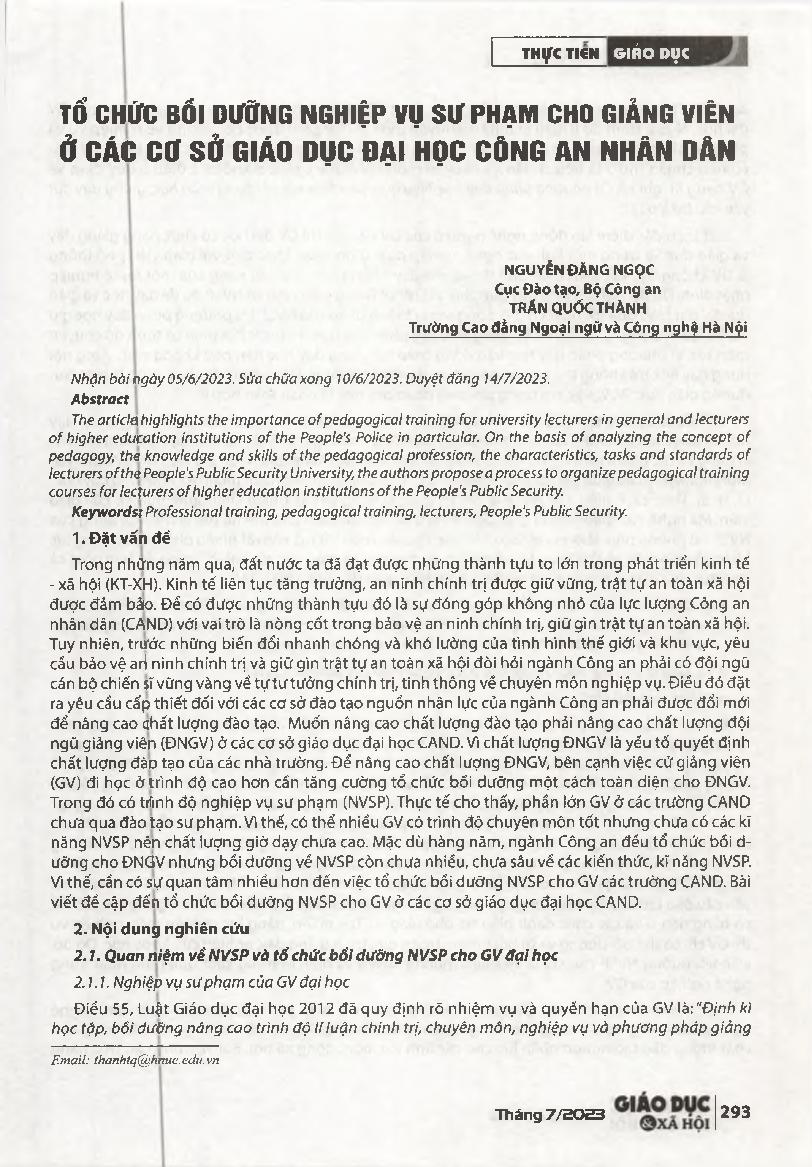 Tổ chức bồi dưỡng nghiệp vụ sư phạm cho giảng viên ở các cơ sở giáo dục đại học Công an nhân dàn = Organizing pedagogical training for lecturers at higher education institutions of the People's Public Security.