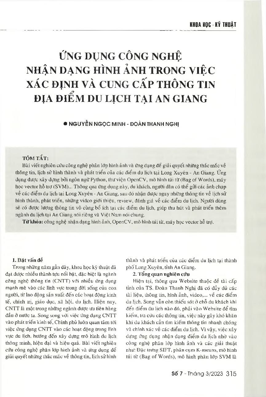 Ứng dụng công nghệ nhận dạng hình ảnh trong việc xác định và cung cấp thông tin địa điểm du lịch tại An Giang = Using the image layering technology to identify and provide information about tourist attractions in Long Xuyen city, An Giang province