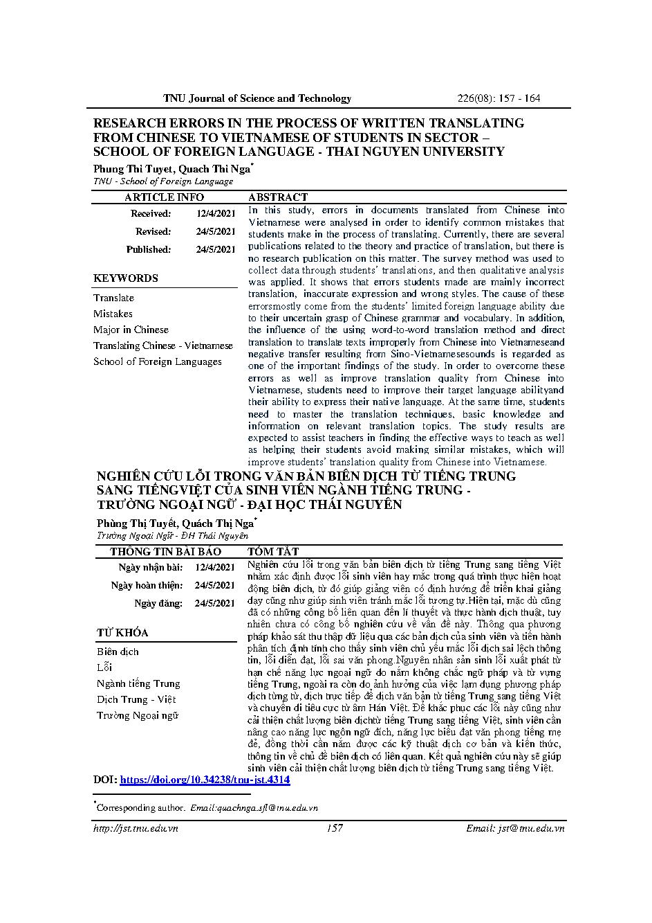 Nghiên cứu lỗi trong văn bản biên dịch từ tiếng Trung sang tiếng Việt của sinh viên ngành tiếng Trung - trường ngoại ngữ - Đại học Thái Nguyên = Research errors in the process of written translating from chinese to vietnamese of students in sector – school of foreign language - thai nguyen university
