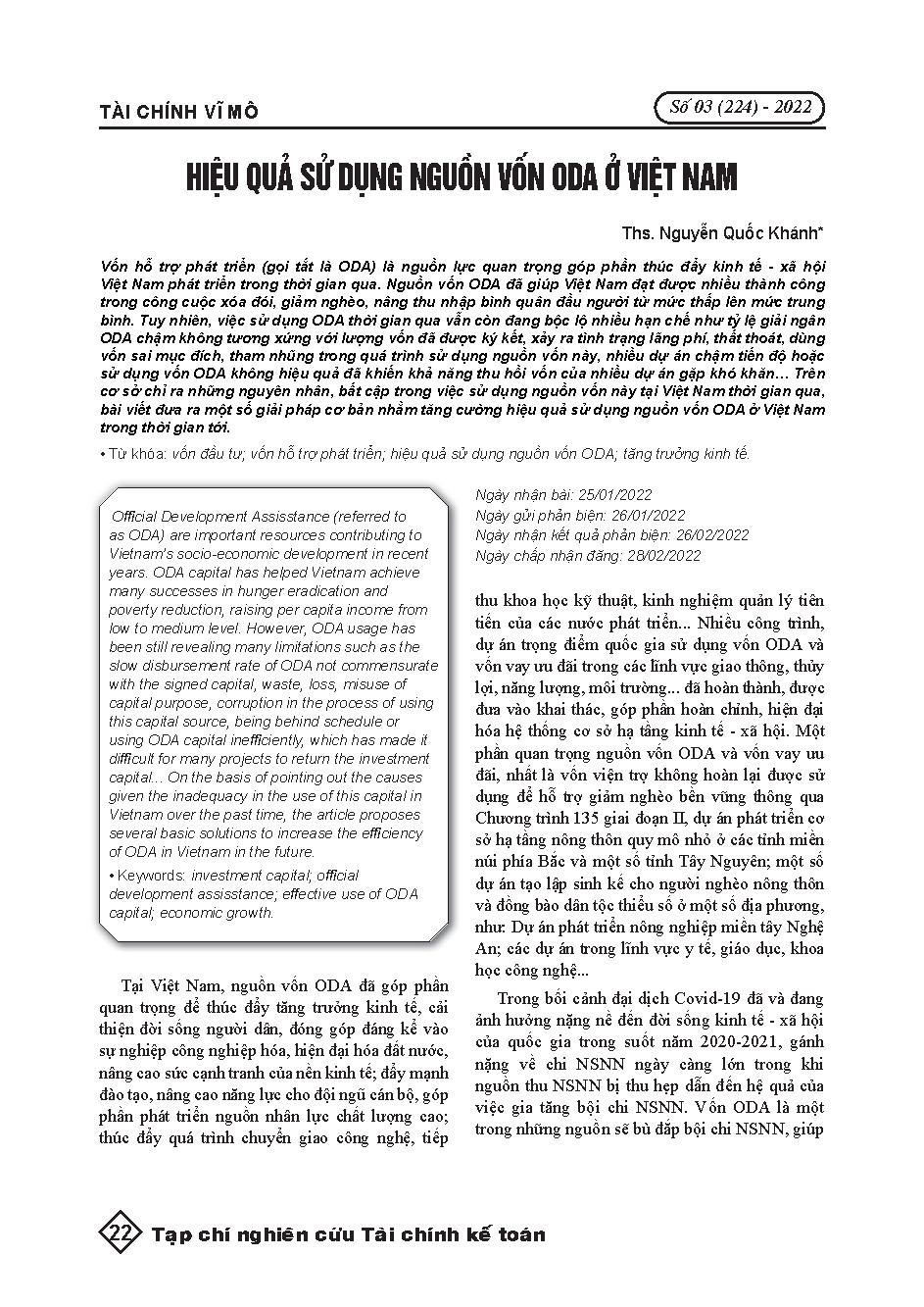 Hiệu quả sử dụng nguồn vốn ODA ở Việt Nam = Using efficiency of ODA in Vietnam
